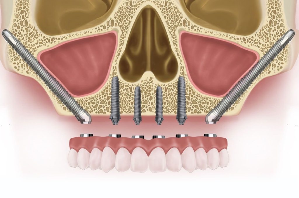Cerrahi işlem genellikle lokal anestezi veya sedasyon altında yapılır. Bazı durumlarda genel anestezi de tercih edilebilir. Operasyon sırasında diş eti açılır ve özel uzun implantlar elmacık kemiğine doğru açıyla yerleştirilir. Bu implantlar klasik implantlardan daha uzun yapıdadır. Bu sayede sağlam kemik dokusuna ulaşarak güçlü bir destek oluşturur.